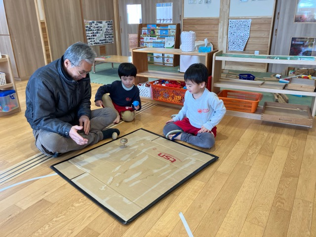 おばあちゃんと一緒に絵あわせをしたり、おじいちゃんとお正月遊びのこま回しや風船羽付きなどを楽しんでいました。